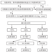 使用毒物体外清除技术的绝对适应证是同时具备下列条件:摄入大量致死性毒物、没有特效解毒剂或其他替代方法、有可以有效清除该毒物的体外清除方法。其他患者是否需要进行毒物体外清除,需在综合分析毒物的分子质量、蛋白结合率、分布容积、内源性清除率等毒理学特性、摄入毒物剂量及患者病情后判定,并根据毒物的毒理学特性选择毒物体外清除方法[24,25],要点见图1。