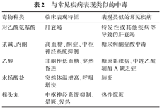 检查的重点是发现提示某种中毒的特殊中毒综合征。中毒综合征是某种或某类毒物中毒引起的一系列症状和体征的总称。典型的中毒综合征常常能提示中毒的诊断和毒物的种类。特别是在没有明确毒物接触史的情况下,对中毒的及时诊断、及早判断毒物种类至关重要[9,10]。由于篇幅所限,此处仅列出部分常见中毒综合征,见表1。其他中毒综合征可参考其他中毒文献。有些毒物的中毒表现与某些疾病非常相似,遇有类似情况时必须怀疑中毒的可能。部分与常见疾病表现相似的中毒见表2。
