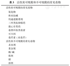 活性炭吸附曾经是清除胃肠道毒物的主要方法,但同样缺乏其有效性的相关证据,且存在误吸等风险,因此不再推荐常规使用。是否使用活性炭应在评估其风险和收益后决定,包括摄入的毒物种类、摄入的时间和已经采取的治疗措施、是否有特效解毒剂或其他清除污染的替代方法等[18]。目前认为,具备下列情况是使用活性炭吸附的指征:摄入大量的致命性毒物、摄入时间在1 h以内、活性炭可吸附该毒物、患者能够配合。活性炭可以吸附和不可吸附的常见毒物见表3。使用时,活性炭的剂量一般为儿童每次0.5~1.0 g/kg或10~25 g,成人为25~100 g,但应根据摄入毒物的剂量调整,有学者建议活性炭与毒物的剂量之比以重量比10∶1为宜[19]。