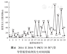 PICU固定床位27张,2014年实施有创通气484例,发生密度为0.8%,2015至2016年有创通气1 379例,发生密度为0.2%,脱管发生率明显降低(χ2=5.936,P=0.018)。图4中2014年即管理制度实施前脱管病例间隔天数中位数8(4,20) d,管理制度实施后2015至2016年脱管病例间隔天数为34(19,61) d,脱管间隔天数延长。35例患儿的脱管间隔天数见图4,其中前21例为2014年脱管患儿编号,22~35为2015至2016年脱管病例。管理小组在2015年发现编号26、27、28的患儿脱管发生间隔天数缩短时及时督导,巩固了管理效果,2016年无相似现象发生。