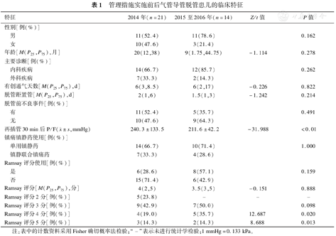 本次研究对镇静的评估管理作为重点,发生非计划性气管导管脱管的患儿用药习惯、评分结果等差异不大。Ramsay评分使用比例从2014年的28.6%升至2015至2016年的57.1%。2014年Ramsay评分4(2,5)分,2015至2016年3.5(3,5)分,未见统计学差异;进一步分析实施镇静评估管理SOP后Ramsay评分3~4分比例高于2014年(P<0.05),见表1。