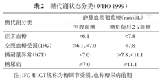 目前国际通用的诊断标准和分类是WHO(1999年)标准。糖尿病诊断、糖代谢状态分类标准和糖尿病的分型体系见表2、表3、表4[14,15]。