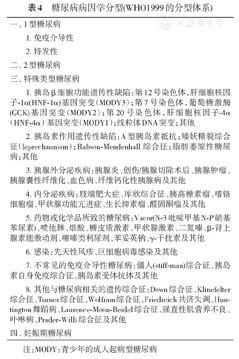 | 1.胰岛β细胞功能遗传性缺陷:第12号染色体,肝细胞核因子-1α(HNF-1α)基因突变(MODY3);第7号染色体,葡萄糖激酶(GCK)基因突变(MODY2);第20号染色体,肝细胞核因子-4α(HNF-4α)基因突变(MODY1);线粒体DNA突变;其他 | |