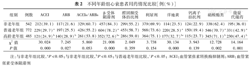 注:与非老年组比较,aP<0.05;与非老年组比较,bP<0.05;与普通老年组比较,cP<0.05; ACEI:血管紧张素转换酶抑制剂;ARB:血管紧张素受体阻滞剂