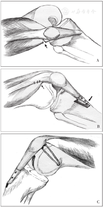 仔细触摸分辨股外侧肌腱与股中间肌腱之间的界限,将股外侧肌腱在髌骨上缘行"L"形切断(图1A);切断后向近端分离至股外侧肌的肌腹,将切断的股外侧肌腱在松弛位置与股中间肌腱缝合(图1B),以达到股外侧肌腱延长的目的。