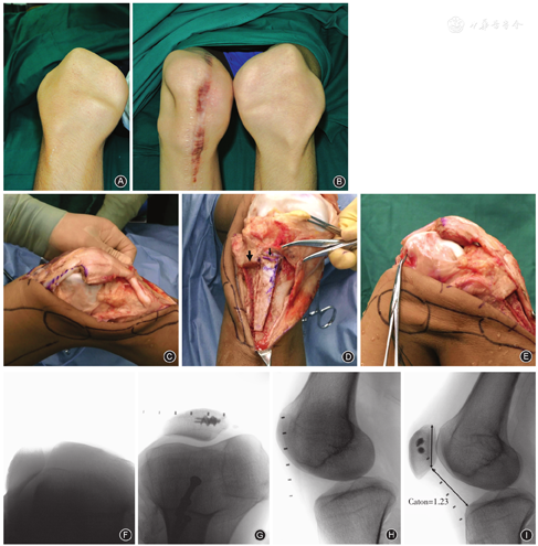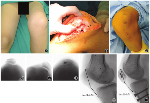 重度习惯性髌骨脱位患者的特点是小角度脱位,患者在屈膝< 60°时已出现髌骨向外侧脱位,甚至有些患者在伸直位髌骨就已经脱位(即固定性脱位),如强行复位髌骨会导致无法屈膝,或即使在伸直位髌骨也无法强行复位至中线位置。对于此类患者,除行广泛松解和股外侧肌腱切断外,还需将胫骨结节向近端移位,恢复伸膝装置的长度,才能复位髌骨。本组有29例属于此类脱位。