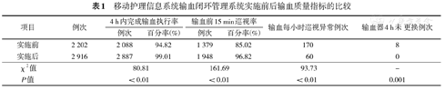 见表1。结果显示,移动护理信息系统输血闭环管理系统实施后,4 h内完成输血执行率、输血每小时巡视异常例次、输血前15 min巡视执行率、输血器4 h未更换例次均优于实施前,实施前后比较差异统计学意义(P<0.01)。