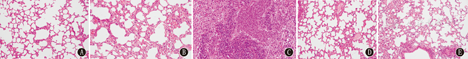 每组各取5只小鼠右下肺组织,100 g/L甲醛固定,常规石蜡包埋,切片,苏木精-伊红(HE)染色镜检。