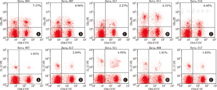 分别取各组PBMCs 100 μL于流式管中,加入流式抗体anti-mouse-APC-IL-17和anti-mouse-FITC-CD4或anti-mouse CD25-APC和anti-mouse-FITC-CD4进行标记(操作按美国eBioscience公司试剂盒说明书要求进行)。室温25 ℃静置,避光染色30 min。用洗涤液洗2次,每次加洗涤液2 mL,300×g离心5 min。弃上清,加入20 g/L多聚甲醛固定液300 μL重悬细胞。流式细胞仪分析。