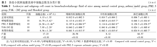 Leukocyte and subgroup cell count in bronchoalveolarlavage fluid of mice among normal control group,asthma model group,PM2.5 group,TAK-242 group and Honokiol group (