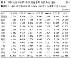 包括代表我国东西南北中不同地域,自然条件不同,经济发展水平不同,人文环境、医疗资源及服务水平不同的黑龙江、北京、河南、山东、山西、陕西、安徽、湖南、广东、广西、重庆、青海等12省市自治区,1~6岁儿童323 858人。其中男174 391人,女149 467人。本课题经佳木斯大学科研伦理委员会审批(JMSU-213),患儿监护人在参与调查之前均签署知情同意书。各年龄段分布情况见表1。
