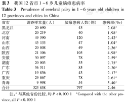 12省市调查区域内2005年1月1日至2010年12月31日出生的儿童总数为323 858人,确诊脑瘫患儿为797例,总患病率为2.46‰(1~6岁)。青海省患病率最高(5.40‰),山东省患病率最低(1.04‰),经比较,任意两省患病率差异均有统计学意义(均P<0.000 1),见表3。
