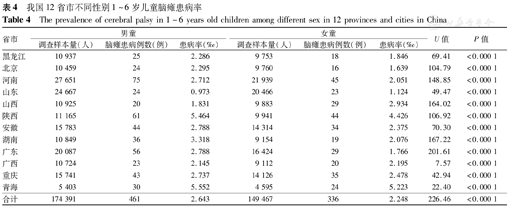 The prevalence of cerebral palsy in 1-6 years old children among different sex in 12 provinces and cities in China