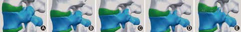 在Mimics软件中对模型分别采用布尔减操作,模拟腰椎侧路内镜下L5左侧上关节突的分级切除。分组:A组为正常脊柱结构,B组为上关节切除1/4,C组为上关节切除2/4,D组为上关节切除3/4,E组为上关节全切除(图3)。在模拟切除相应骨性结构时,骨性结构表面的关节囊一并切除,关节突周围其他韧带不作任何处理。
