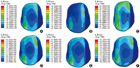 椎间盘压力分布云图显示,L4/5椎间盘所受压力随着切除范围的增加而增大。当L5左侧上关节突切除1/4时,L4/5椎间盘内压力在后伸及右旋转载荷下与未切除组差异均有统计学意义(q=6.918、6.438,均P<0.05),而在腰椎前屈、左右侧屈以及左旋转时差异无统计学意义(q=2.118、4.080、3.945、2.182,均P>0.05);L5左侧上关节突切除2/4时,与未切除组对比,L4/5椎间盘内压力在前屈后伸、左右侧屈及右旋转载荷下差异均有统计学意义(q=5.260、17.15、5.727、8.890、15.66,均P<0.05),而在腰椎左旋转时差异无统计学意义(q=0.985,P>0.05);当L5上关节突切除3/4时,腰椎在前屈后伸、左右侧屈、左右旋转6个方向载荷下,椎间盘承受的压力与未切除组对比差异均有统计学意义(q=6.867~25.19,均P<0.05);当L5上关节突切除4/4时,腰椎以上6个方向载荷下,椎间盘承受的压力与未切除组对比差异均有统计学意义(q=11.12~82.21,均P<0.05)(图5和表3)。