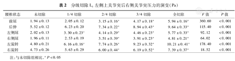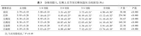 | 腰椎状态 | 未切除 | 1/4切除 | 2/4切除 | 3/4切除 | 全切除 | F值 | P值 |