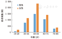 共纳入患者9 200例,其中男3 284例(35.70%),女5 916例(64.30%),男女比例1∶1.8,年龄19~85(53.68±12.46)岁。发病年龄高峰段为45~59岁,不同性别眩晕/头晕患者年龄分布情况见图1。