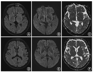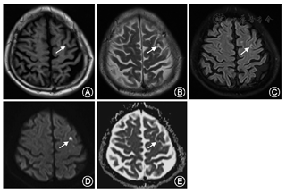 额叶主要功能与随意运动和高级精神活动有关,其主要功能区包括皮质运动区,运动前区以及皮质侧视中枢等。既往研究常提示额叶功能障碍可导致痴呆、癫痫、眼球运动障碍、把握和摸索反射、人格改变等[12]。目前,偏侧舞蹈症继发于皮质梗死十分罕见,国外可见额叶和顶叶受累致偏侧舞蹈或偏侧投掷的个案报道,额中回梗死致偏侧舞蹈症国内未见报道[13]。皮质运动区(中央前回)前方,即运动前区是锥体外系的皮质中枢,发出纤维到丘脑、基底神经节和红核,与运动和姿势协调有关;额叶脑桥小脑束也在这个区域,与协调运动有关。在临床上,我们常常观察到影像学发现皮质有较大的梗死灶,而临床未出现不自主运动的表现;抑或DWI序列仅表现微小的弥散受限信号影,而没有任何临床症状和体征。本例患者仅为额叶皮质微小梗死灶所致急性偏侧舞蹈症,我们认为尽管该患DWI提示在皮质仅有一个极小的梗死灶,但可能还存在着皮质下,甚至底节区有低灌注的可能,所以才产生对侧面肌轻度无力和上下肢广泛的不自主运动的表现。任何发生在皮质到脑干运动系统的卒中,无论病因分型或病变大小均可出现卒中后不自主运动[14]。然而,没有任何一种卒中后运动障碍类型可归因于特定的病灶位置,颅脑磁共振成像可更精确的定位受累的结构,使每个综合征可具体到病变类型。目前,有报道认为各种过多或过少运动障碍可归因于分水岭或边缘区梗死,其与发生在位于不同动脉供血的血管边界之间的低灌注区,影响额叶皮质下区伴或不伴有纹状体受累有关[15]。