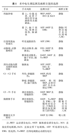 外科医生、麻醉医生和神经电生理监测医生协同合作,根据具体的手术部位、入路和方式,针对术中易损功能区或神经传导通路,选择合理的神经电生理监测模式和方案,据此决定最佳的麻醉方法,确定监测报警阈值。术中电生理监测及麻醉方案的选择见表1[4]。