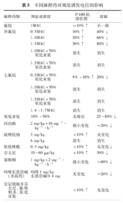 吸入麻醉剂对VEP有影响,全凭静脉麻醉也并不增加VEP的稳定性。麻醉药物对视觉诱发电位的影响见表5[15]。