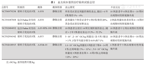 | NCT01687608 | 包含Padua突变的密码子优化的FⅨ | AAV8 | 静脉注射 | 高剂量组7例受试者中1例FⅨ维持20%,其余受试者仅短暂表达 | 2例高剂量组患者在第4~8周时出现暂时性转氨酶升高 |