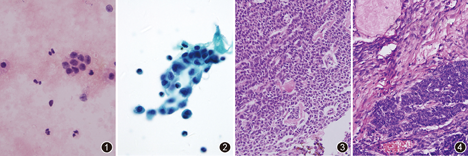 病理检查:(1)血性腹水标本:100 mL,均分为2份,1份取沉淀液涂抹常规涂片,HE染色,剩余沉淀物用于制作细胞块;另1份沉淀物用于液基薄层细胞制片,巴氏染色。镜下观察:常规细胞涂片中可见在多量增生的间皮细胞和淋巴细胞的背景上,肿瘤细胞松散或紧密聚集成团,其细胞较小,胞质稀少,红染,核圆、卵圆形或梭形,核无明显异型性,染色质细腻,小核仁,核膜清楚,部分细胞有纵行核沟(图1),未见明显核分裂象(图4)。还可见一些裸核细胞。在薄层液基细胞制片中可见细胞形态与常规涂片一致,但背景更加干净,肿瘤细胞较为集中(图2)。(2)送检标本:右附件占位大小7 cm×6 cm×5 cm,囊实性,实性区为主,切面灰白/灰黄,灶性出血。在细胞块中可见肿瘤细胞较涂片和液基制片更为集中,部分区域可见Call-Exner小体(图3)。肿瘤细胞对α-抑制素、Calretinin、CD56、S-100蛋白、WT1均阳性表达,对上皮细胞膜抗原(EMA)阴性表达。右附件占位肿瘤细胞呈岛状或梁索状排列,部分区域呈滤泡状排列。肿瘤细胞呈多角形、圆形或梭形,胞质较少,红染,胞界不清楚。核圆或卵圆形、梭形,核膜清楚,部分细胞核内有一小核仁,部分细胞有纵行核沟,未见明显核分裂象(图4)。肿瘤细胞免疫表型与细胞块一致。