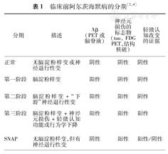 2011年,美国国立老化研究所与阿尔茨海默病协会正式提出了临床前AD的概念性框架和用于研究的标准[2]。该标准对临床前AD进行了分期,包括第一阶段,无症状脑淀粉样变的阶段;第二阶段,淀粉样蛋白阳性+突触功能障碍和(或)早期神经退行性变阶段;第三阶段,淀粉样蛋白阳性+神经退行性变的证据+极轻微的认知下降[2](表1)。该标准强调了生物标志物在临床前AD早期诊断中的价值:通过PET淀粉样蛋白显像上示踪剂保留增多和(或)脑脊液中Aβ42含量下降来追踪脑内淀粉样变,通过脑脊液tau或磷酸化tau水平增高、FDG-PET脑内AD样代谢减低以及特定解剖分布(顶叶后部和中部、后扣带回和后颞叶)的灰质丢失、海马萎缩来追踪早期神经退行性变。
