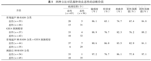 本研究应用CEUS预测模型联合及调整常规超声BI-RADS分类两种方法鉴别乳腺肿块良恶性,结果显示,常规超声BI-RADS分类+CEUS预测模型诊断效能较单一应用常规超声BI-RADS分类及CEUS预测模型未见明显优势,ROC曲线下面积分别为0.833、0.756、0.828,差异均无统计学意义;而调整后BI-RADS分类相较其他三种方法可提高肿块良恶性诊断的正确率,诊断效能最高,ROC曲线下面积为0.870,且与常规超声BI-RADS分类比较差异有统计学意义。此外,虽然调整后BI-RADS分类的特异度虽略低于常规超声BI-RADS分类+CEUS预测模型,但其敏感度及正确性最高,分别达97.2%、86.1%,更适用于乳腺癌早发现、早诊断、早治疗的临床原则,有利于乳腺癌的预后和提高患者的生存质量。调整后24个良性肿块降为3类,可以短期随访代替穿刺活检,18个恶性肿块升为5类,使肿块诊断更加明确,而BI-RADS 4类肿块降至34个,使57.0%(45/79)肿块避免了穿刺活检,且仅有3.8%(3/79)肿块发生漏诊、误诊。