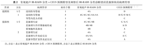 常规超声BI-RADS分类+CEUS预测模型及调整后BI-RADS分类诊断错误乳腺肿块的病理类型