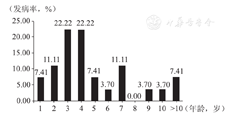 2005年1月1日至2017年7月1日就诊于首都医科大学附属北京儿童医院外科,年龄≤28 d,明确诊断为胃穿孔并且行手术治疗,病历及随访资料完整的27例患儿。男21例(77.78%),女6例(22.22%),平均年龄4.05 d(3.24~7.01 d),发病率与发病年龄的关系如图1。