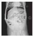 患儿发病前均无明确诱因,其临床表现为腹胀及呕吐(12例,44.44%)、腹胀(9例,33.33%)、反应差(3例,11.11%)及呼吸困难(3例,11.11%)。典型的新生儿胃穿孔立位腹部X线片表现为双侧膈下大量游离气体,内脏受压下移,严重者肝脏受压可呈半月形或马蹄形,胃泡变小甚至消失,出现横贯腹腔的大液气平面(图2)。
