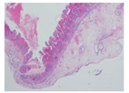 12例(44.44%)患儿术中证实病因为胃壁肌层缺损,病理结果表现为胃壁肌层缺损,固有层及黏膜下层水肿,散在较多淋巴、中性粒细胞浸润(图3);1例(3.71%)患儿因完全型大动脉转位、动脉导管未闭、卵圆孔未闭行低温体外心内直视Switch手术,术后20 d出现应激性胃溃疡穿孔;另外14例(51.85%)无明确病因。