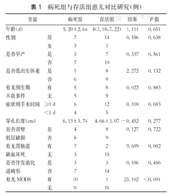 这种肌纤维间距在早产儿中更易被发现,Lin等[17]认为胃壁结构发育不良和胃肠道蠕动功能不佳是早产儿胃穿孔的主要病因,但是早产是否构成胃穿孔预后不良的因素,国内外研究尚存在争议。一些学者认为早产、低出生体质量患儿预后不良[17,18],Byun等[6]研究表明早产、低出生体重与病死率无关。本研究发现早产、低出生体质量在死亡组与生存组间差异无统计学意义,不构成预后影响因素。除此之外,是否存在围生期不良事件,以及是否合并消化道畸形在两组间差异亦无统计学意义,表明患儿围生期情况及有无消化道畸形对预后的影响不大。