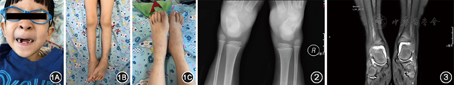体格检查:身高94 cm,体重18.5 kg。神志清,反应可,体形消瘦,面色苍白,全身无皮疹;颈部、颌下及锁骨上可扪及肿大淋巴结,最大2 cm×1.5 cm,质软光滑,无触痛,活动度欠佳,局部无红肿;口唇干燥、苍白,可见龋齿,呼吸稍促,双肺呼吸音粗,未及干湿性啰音;心音有力,律齐,未闻及病理性杂音;腹部膨隆,肝肋下4 cm,质韧光滑,脾脏右肋下平髂前下棘。双膝、双踝、右腕关节肿胀伴活动受限(图1),局部皮温升高,触痛明显,四肢肌力及肌张力正常,神经系统查体未见异常。毛细血管充盈时间1 s。