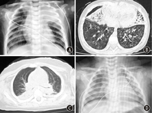 A: a 4 months male infant,chest X-ray showed both lungs had patchy shadows,and the upper lobe of the left lung had consolidation; B: a 2 years and 5 months old male child,chest CT showed both lungs had scattered shadows,and right middle lobe and left lingular segment had consolidation,whose volume slightly narrowed and air bronchogram was positive; C: a 6 months male infant,chest CT showed the dorsal segment of both lungs had patchy shadows and consolidations; D: a 8 months female infant,chest X-ray showed both lungs had exudation,and right lung had patchy shadows