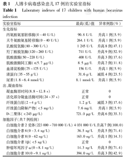 血常规:白细胞计数(3.73~16.6)×109/L,减低1例(5.9%),升高5例(29.4%);血红蛋白72~121 g/L,减低10例(58.8%);血小板(180~673)×109/L。余实验室指标见表1。