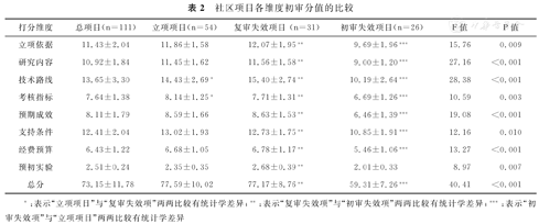 本研究运用SPSS19.0统计软件进行数据分析。项目总分、各维度分值运用描述性统计;采用方差分析方法比较初审阶段中初审失效项目、复审失效项目和立项项目在总分、各维度均值上的差异,两两比较采用LSD法;复审阶段的立项项目及复审失效项目均值比较则选用t检验,偏态资料如"预初实验"则表示为中位数(四分位数),采用秩和检验。