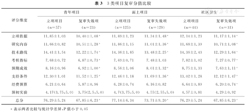 结果显示,复审阶段,三类科研项目的立项项目与复审失效项目总分差异存在统计学意义(P<0.05)。在维度比较中,共同存在统计学差异的条目包括:立项依据、研究内容、技术路线等3个维度条目(P<0.05);在预初实验这一维度,3类项目均不存在统计学意义(P>0.05)。