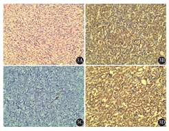患者,男性,64岁,主因间断性意识障碍1个月余入院。患者入院前1个月突发意识障碍、抽搐、言语错乱,对自身活动无印象,每次发作集中在凌晨4点至上午8点,2~4 h后症状缓解,频繁发作无规律性。住院期间发作6次,每次持续约0.5~1 h,发作时血糖波动于1.7~2.1 mmol/L,给予50%葡萄糖20 ml静脉注射,吸氧20 min后症状缓解。查体:右侧胸廓饱满,叩诊右下肺呈实音,听诊右下肺呼吸音消失,双肺未闻及干湿性啰音;神经系统查体未见异常。胸部CT示:右侧胸腔内可见一大小24 cm×17 cm×7 cm类圆形肿物,边缘光滑,质地均匀,考虑为胸腔占位(图1)。头颅核磁、脑电图未见异常;腹部彩色超声未见异常;生化检查示:空腹血糖3.5 mmol/L,餐后血糖8.6 mmol/L;空腹胰岛素1.1 mU/L;糖化血红蛋白、C肽正常;肿瘤相关标志物甲胎蛋白、癌胚抗原、糖类抗原(CA)13、CA199、CA125、前列腺特异性抗原(PSA)、神经元特异性烯醇化酶(NSE)、细胞角蛋白19片段21-1(CYFRA21-1)均正常;初步诊断为右侧胸腔占位。完善相关检查后于2014年5月9日行全身麻醉后手术,右侧胸腔内一大小24 cm×17 cm×7 cm类圆形肿物,包膜完整,带蒂与后纵隔相连,与周围肺组织界限清楚,手术完整切除肿物。术后病理结果示:灰白、灰褐色分叶状结节样肿物一个,包膜完整,大小24 cm×17 cm×7 cm(图2),切面灰红色鱼肉状;细胞形态学检查示肿瘤由梭形细胞构成,细胞核形态不一,间质富含胶原(3A)。免疫组织化学结果示:bcl-2(+++)(图3B)、CD34(局灶性+)(图3C)、CD99(-)、S-100(-)、CK(-)、Vimentin(+++)(图3D)、Ki-67(>15%+)、LCA(-)。病理诊断为SFTP。术后恢复良好,无意识障碍及低血糖发生,术后多次复查空腹血糖在4.9 mmol/L以上。术后随访40个月无复发,未再发生意识障碍及低血糖。