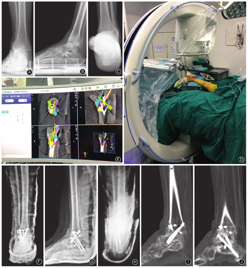 采集图像后,于机器人系统内行4枚无头加压螺钉置钉规划,其中2枚交叉螺钉由胫骨远端前方至跟骨后结节,1枚螺钉自距骨颈至跟骨后结节,1枚螺钉自胫骨远端后方至距骨头,规划每枚螺钉的大小、方向以及长度(图1E)。在机器人系统机械臂瞄准辅助下经皮依次置入规划的螺钉,"C"型臂透视下确认螺钉位置是否满意。纵劈截下的远段腓骨,将外侧部分作为骨板并以3枚普通螺钉固定于胫骨、距骨及跟骨,冲洗后缝合伤口。
