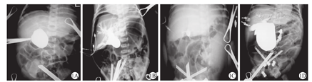 碘海醇通过胆囊或囊肿注入后,所有囊肿均有显示。24例Ⅰ型CBA患儿均有肝内胆管显影(图1A),其中包括6例患儿肝内胆管扩张(图1B)。5例Ⅲ型CBA患儿囊肿与肝内外胆管无相通(图1C)。所有CBA患儿十二指肠均无显影。67例CC患儿肝内胆管均有显影,其中包括29例患儿肝内胆管扩张,大部分CC患儿囊肿与十二指肠相通(图1D)。CBA组包括24例Ⅰ型和6例Ⅲ型囊肿型胆道闭锁患儿,24例Ⅰ型CBA患儿行肝管空肠吻合术,5例Ⅲ型CBA患儿行肝门空肠吻合术。CC组患儿均行肝管空肠吻合术。