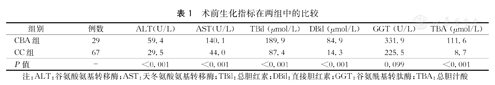 术前生化检查示,CBA组与CC组ALT中位数分别为59.4 U/L和29.5 U/L,AST中位数分别为140.1 U/L和44.0 U/L,TBil中位数分别为189.9 μmol/L和87.4 μmol/L,DBil中位数分别为84.9 μmol/L和14.3 μmol/L,TBA中位数分别为111.6 μmol/L和8.7 μmol/L,上述指标组间比较,差异均有统计学意义(P均<0.001,表1);但两组GGT中位数331.9 U/L和225.5 U/L比较,差异没有统计学意义(P>0.05)。