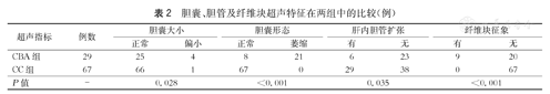 胆囊、胆管及纤维块超声特征在两组中的比较(例)