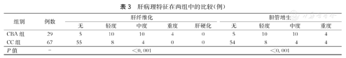 CBA组与CC组的肝活检结果如表3所示,CBA组与CC组均存在不同程度的肝纤维化与胆管增生。29例CBA患儿中,无肝纤维化5例(17.2%),轻度肝纤维化10例(34.5%),中度肝纤维化10例(34.5%),重度肝纤维化4例(13.8%),无肝硬化患儿。67例CC组患儿中,无肝纤维化55例(82.1%),轻度肝纤维化8例(11.9%),中度肝纤维化4例(6.0%),无重度肝纤维化及肝硬化患儿。CBA组肝纤维化程度严重于CC组,且组间差异有统计学意义(P<0.001)。29例CBA组患儿中,无胆管增生5例(17.2%),轻度胆管增生10例(34.5%),中度胆管增生10例(34.5%),重度胆管增生4例(13.8%)。67例CC组患儿中,无胆管增生54例(80.6%),轻度胆管增生8例(11.9%),中度胆管增生4例(6.0%),重度胆管增生1例(1.5%)。CBA组胆管增生程度严重于CC组,且两组间差异有统计学意义(P<0.001)。
