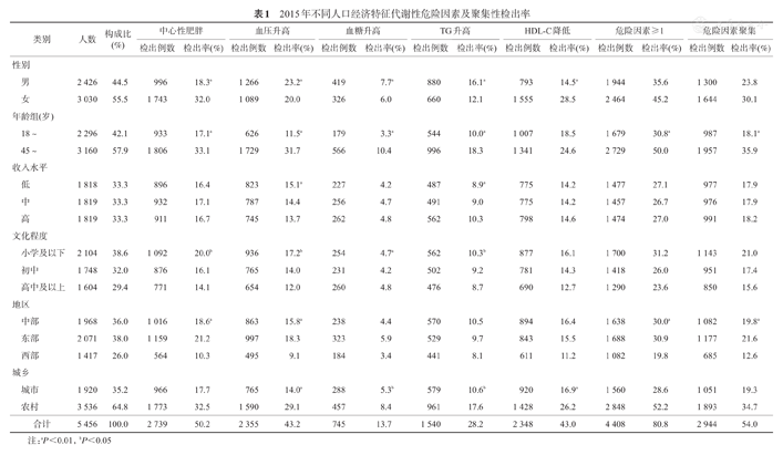 Lu等[9]对2010年我国≥18岁的成年人的心血管代谢性危险因素进行了分析,其中HDL-C降低的检出率最高(60.6%),其次血压升高(49.9%),与本研究中凸显的问题是中心性肥胖检出率较高,其次是血压升高略有不同,其他指标的检出率也存在差异,可能与研究覆盖区域和研究对象年龄不同有关。