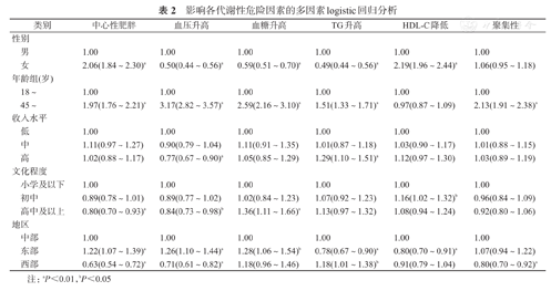 成年女性中心性肥胖和HDL-C降低的危险性高于成年男性,但血压升高、血糖升高和TG升高的危险性低于成年男性;45~59岁成年人中心性肥胖、血压升高、血糖升高和TG升高的危险性均高于18~44岁成年人;与低收入水平组相比,高收入水平成年人血压升高的危险性低,但TG升高的危险性高;与小学及以下文化程度相比,高中及以上文化程度的成年人中心性肥胖和血压升高的危险性低,但血糖升高的危险性高;与中部地区成年人相比,东部地区中心性肥胖、血压升高、血糖升高的危险性分别高22%、26%和28%,但TG升高和HDL-C降低的危险性分别低22%和20%,西部地区成年人TG升高的危险性是中部地区的1.18倍。