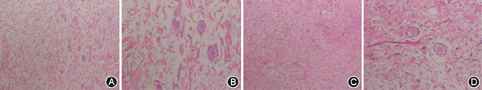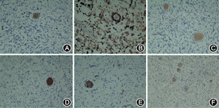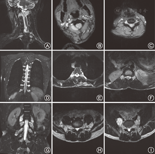 所调查的家系成员共15名,发病患者7例,均发现有肢体无力症状,MRI证实有脊椎多发的椎管内神经纤维瘤,而其他成员MRI均未发现椎管内神经纤维瘤。患者均无咖啡牛奶斑、虹膜Lisch结节、脊柱侧凸,无内脏肿块压迫出血症状,无耳鸣、听力下降,头晕,无持续性头痛、恶心、呕吐和视物不清等颅内压增高等临床表型(图1)。先证者(Ⅲ9)的MRI示左侧丘脑可见小斑片状长T1长T2信号,T2WI-FLAIR呈高信号;余双侧侧脑室旁白质内可见条状或类圆形长T1长T2信号,T2WI-FLAIR呈低信号;部分脑沟、池、室增宽。提示左侧丘脑高信号小病灶,轻度脑腔隙,轻度脑萎缩(图2)。双侧颈胸腰椎椎间孔及骶管扩大,双侧颈、胸、腰及骶神经根走行区见多发串珠状、丛状、囊状类圆形或梭形病灶,边界较清,长T1长T2信号,压脂T2像呈高信号。较大者位于颈1~2双侧椎间孔区,右侧较大,约2.5 cm×2.1 cm×1.8 cm,部分长入局部椎管内,明显压迫局部硬膜囊及脊髓。颈5~6右侧椎间孔区病灶部分长入椎管内右侧部,大小约1.3 cm×1.1 cm×1.8 cm,压迫局部硬膜囊及脊髓,向左侧移位。胸12至腰1左侧椎间孔区病灶部分长入局部椎管内,矢状位约0.9 cm×1.0 cm,局部脊髓圆锥稍受压移位。扫描区内胸腰背部皮质及部分肌肉间隙内见多发病灶,呈等T1等T2信号或长T1长T2信号,最大径约2.6 cm(图3)。颈1~2椎管外、颈5~6椎管内肿瘤切除术后病理:节细胞神经瘤(图4)。免疫组织化学:Ki67(1%+),S100(+++),神经元特异性烯醇化酶(节细胞+),Neu-N(节细胞+),Nf(节细胞+),SY(节细胞+)(图5)。