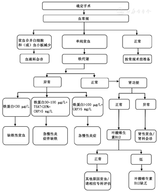 从患者确定手术就应该开始进行贫血筛查,对于贫血患者应尽快明确病因并开始治疗。根据疾病、手术类型,权衡贫血与推迟手术的利弊决定贫血的治疗方法和手术时间。急诊手术也应充分利用术前准备时间完成贫血评估。