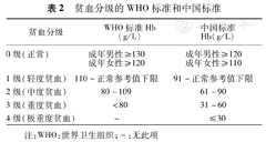 | 贫血分级 | WHO标准Hb(g/L) | 中国标准Hb(g/L) |