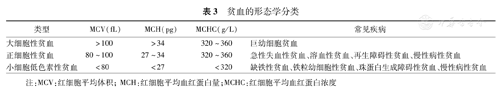 根据红细胞形态可将贫血分为大细胞性贫血、正细胞性贫血、小细胞低色素性贫血3种类型(表3)。